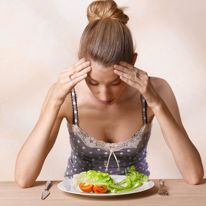 - Osoba uzima niskokalorične male obroke, hrani se “zdravo” – voćem, povrćem i salatama, ne omogućavajući organizmu da dobije dovoljno energije.